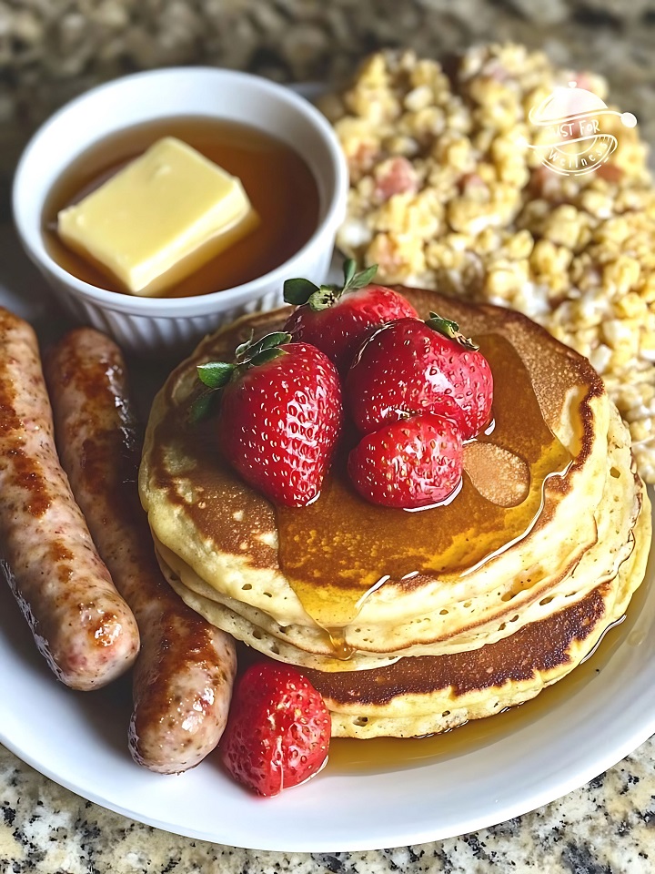 Add fluffy scrambled eggs and sausage links alongside the pancakes. Serve hot for the ultimate easy breakfast idea and a guaranteed morning comfort food classic.